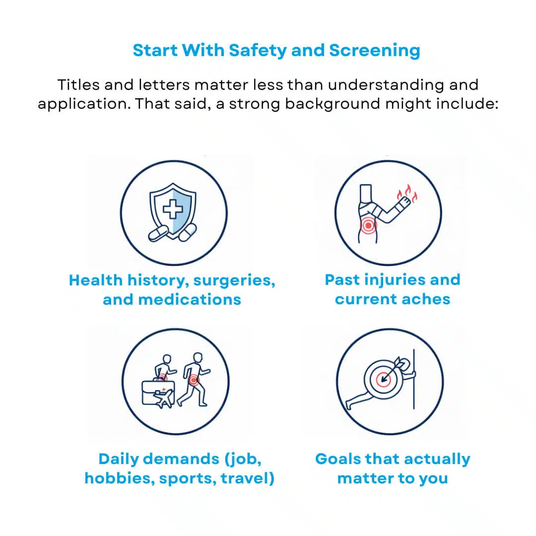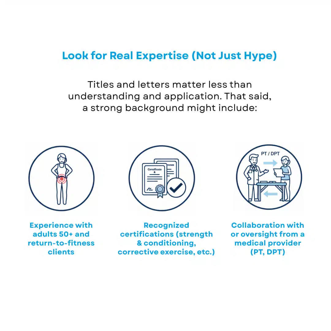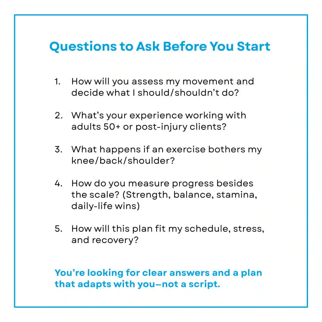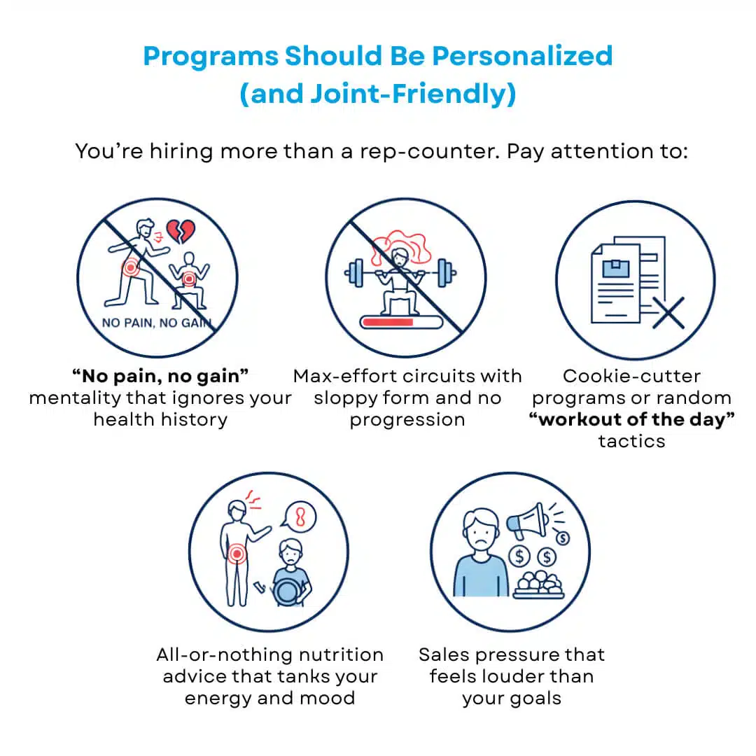 Pro tip: Ask what they do when something hurts mid-session. The right answer includes modifying the exercise, finding pain-free alternatives, and protecting progress—not “push through it.”