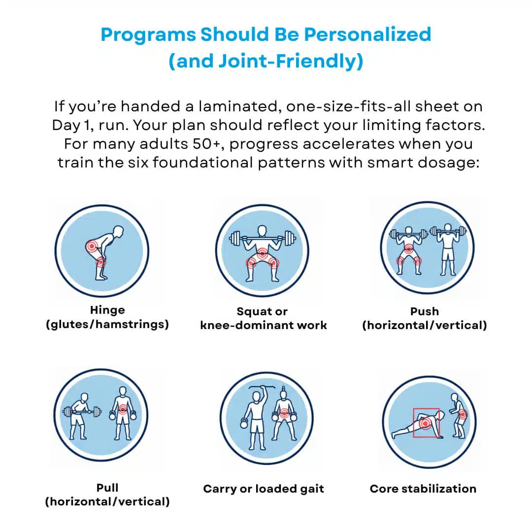 If you’re handed a laminated, one-size-fits-all sheet on Day 1, run. Your plan should reflect your limiting factors. For many adults 50+, progress accelerates when you train the six foundational patterns with smart dosage: