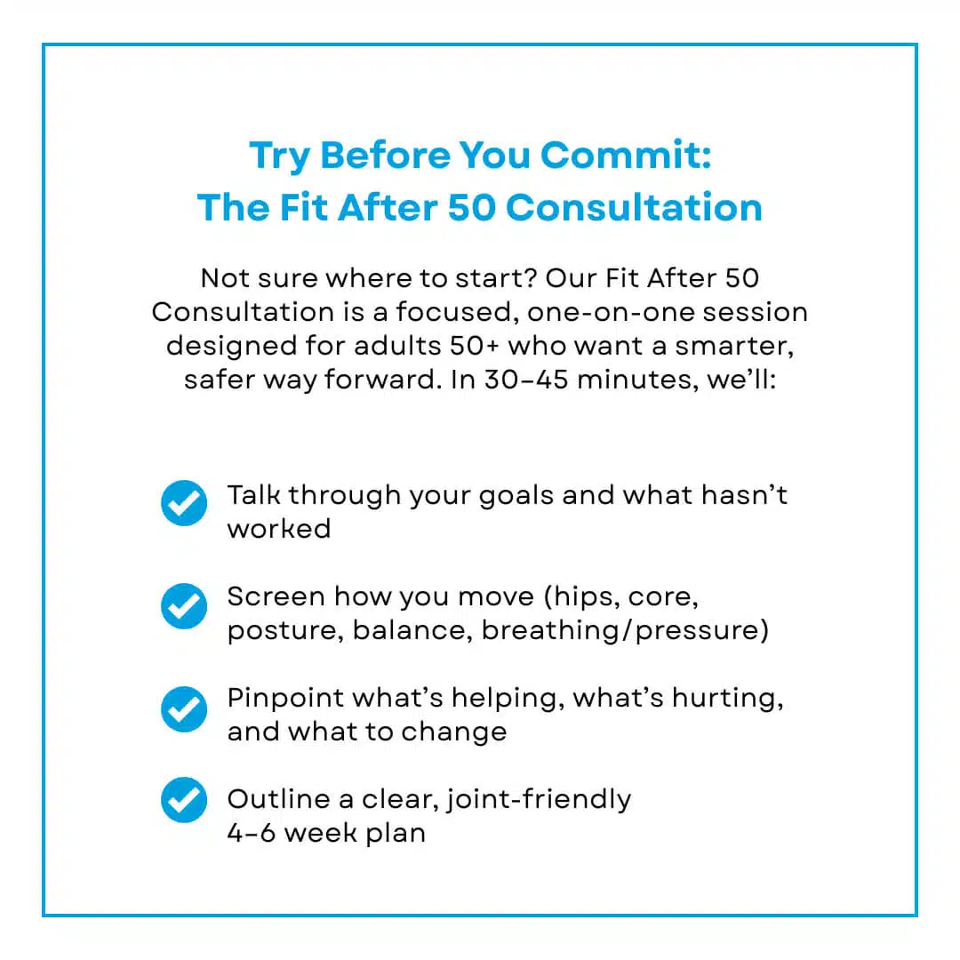 Not sure where to start? Our Fit After 50 Consultation is a focused, one-on-one session designed for adults 50+ who want a smarter, safer way forward. In 30–45 minutes, we’ll: