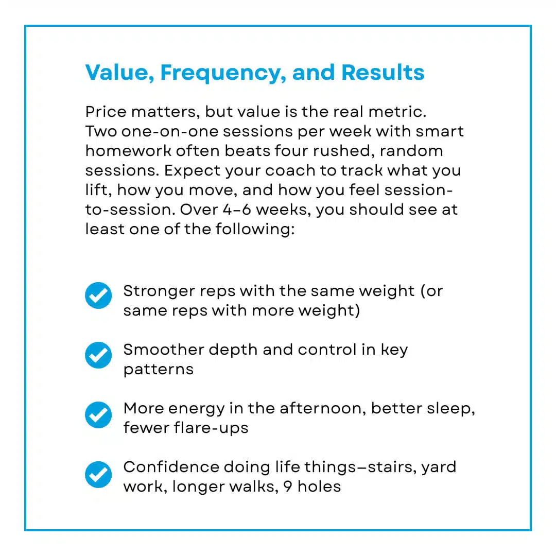 Price matters, but value is the real metric. Two one-on-one sessions per week with smart homework often beats four rushed, random sessions. Expect your coach to track what you lift, how you move, and how you feel session-to-session. Over 4–6 weeks, you should see at least one of the following: