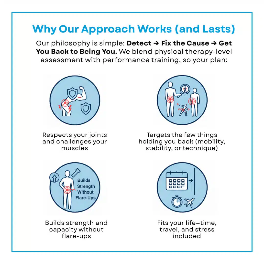 Our philosophy is simple: Detect → Fix the Cause → Get You Back to Being You. We blend physical therapy-level assessment with performance training, so your plan: